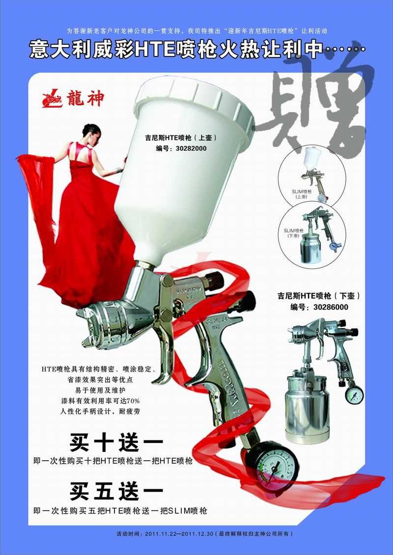 吉尼斯HTE噴槍11月促銷 吉尼斯HTE噴槍2011年11月促銷 (活動已結束,感謝您的關注) 一、主題: 吉尼斯HTE噴槍讓利促銷 二、活動目的: 讓利回饋給力促銷 三、活動時間: 1、 時間:2011年11月21日至2011年12月30日 2、 時長:共計40天 四、活動內容: 1、 買十送一(即一次購買十把HTE噴槍送一把HTE噴槍) 2、 買五送一(即一次購買五把HTE噴槍送一把SLIM噴槍) 市場部 2011年11月17日 宣傳海報 2011-11-19 12901