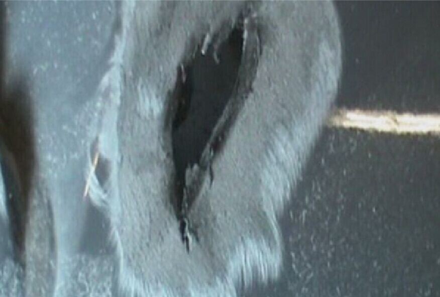 步驟1:當(dāng)塑料件出現(xiàn)穿孔時(shí),首先使用磨頭打磨掉洞孔周?chē)拿蹋鐖D1-1所示。