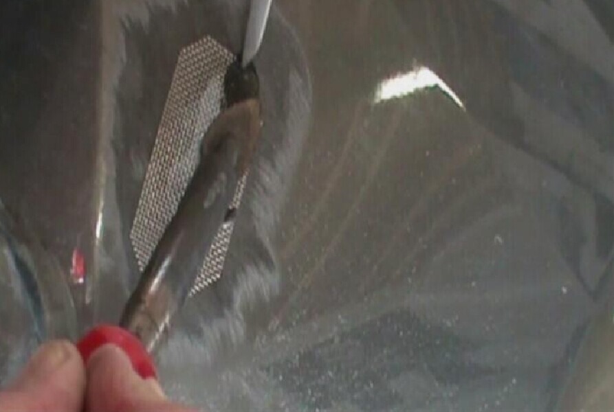 步驟12:打磨至塑料件修補(bǔ)面平整光滑,注意要確保無(wú)銹加固網(wǎng)沒(méi)有裸露,如圖1-12所示。