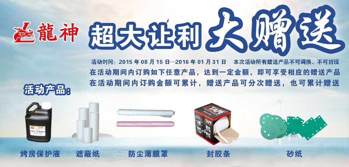 超大讓利﹒大贈(zèng)送 2015-08-17 32025 訂購產(chǎn)品:1、烤房保護(hù)液; 2、遮蔽膜; 3、遮蔽紙; 4、泡沫膠條; 5、砂紙。 在活動(dòng)期間內(nèi)訂購如上任意產(chǎn)品,達(dá)到下表累計(jì)金額,即可享受相應(yīng)的贈(zèng)送產(chǎn)品。