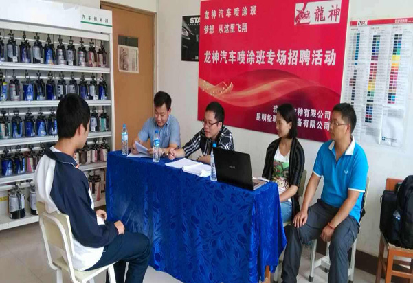 珠海龍神有限公司攜手昆明松騁汽修設(shè)備有限公司與昆明市官渡區(qū)職業(yè)高級中學(xué)建立更深層次的校企合作關(guān)系,開辦龍神噴涂班?,F(xiàn)場選拔面試會已于2014年6月24日在昆明市官渡區(qū)職業(yè)高級中學(xué)隆重舉行!